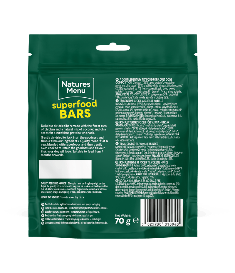 Chicken 65%, Chia Seeds 4%, Coconut 4%, Dried Spinach 0.1%, Pea Protein, Glycerine, Distilled White Vinegar, Dried Sweet Potato, Flaxseed, Thyme, Vegetable Oil, Minerals.