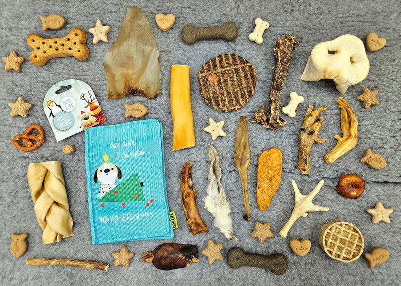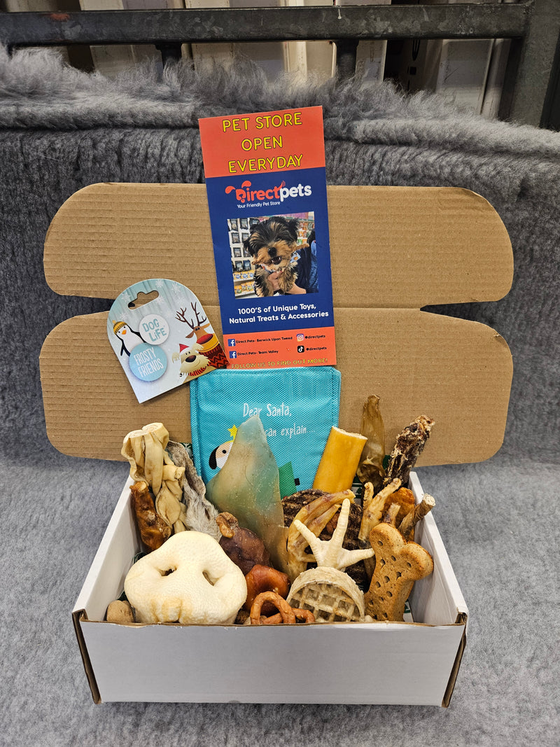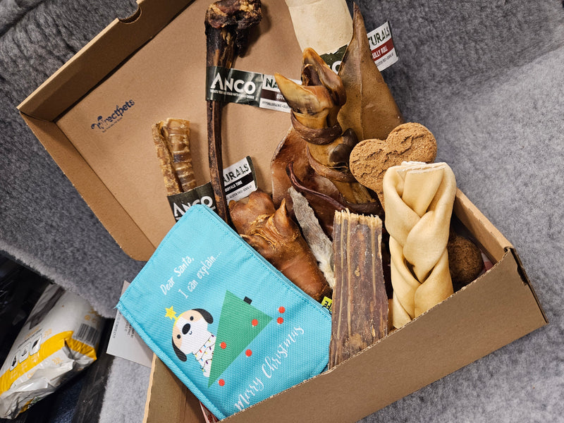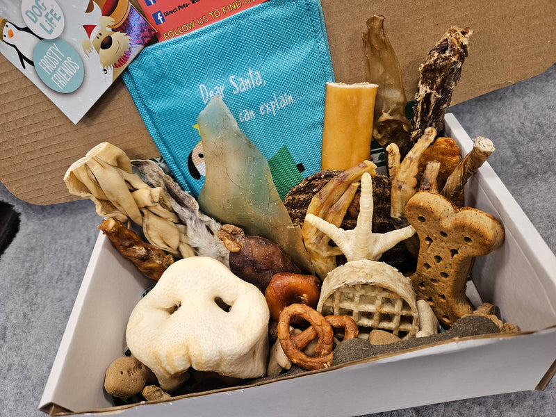 Our Christmas Selection Boxes contain no rawhide products and are suitable for dogs ages 6 months & up. These selection boxes come complete with a gift tag & bow, ready for your dog to open on Christmas Day!